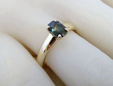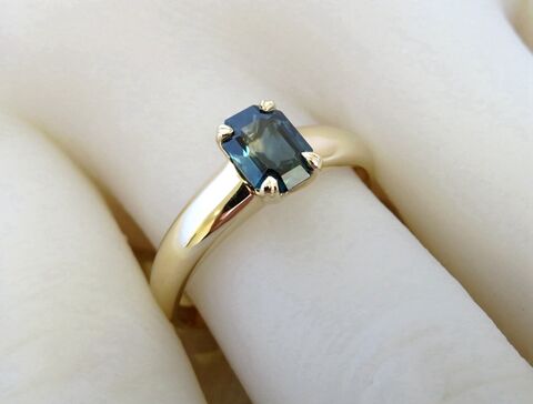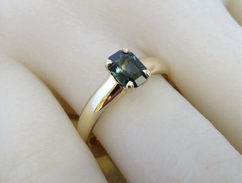 Celebrate timeless elegance with this 14k yellow gold teal sapphire engagement ring. Featuring a 1.04ct natural emerald cut teal sapphire, this classic solitaire design is secured in a refined four-prong setting that highlights the stone’s deep teal hues and crisp facets. The polished yellow gold band tapers gracefully towards the sapphire, creating a harmonious blend of luxury and simplicity. Perfect as an engagement ring or a meaningful statement piece, this handcrafted design from CL Jewellery NZ combines sophistication with everyday wearability.