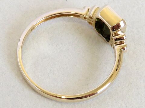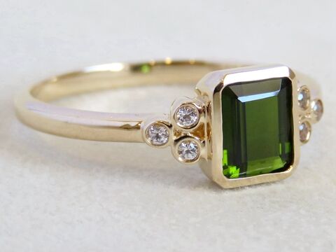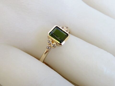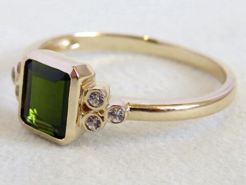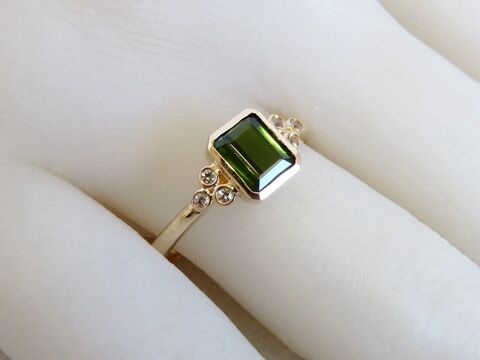 This elegant ring features a 1.1ct natural emerald-cut green tourmaline as the centre stone, showcasing its rich, deep green hue in a modern bezel setting. On each side, clusters of natural white sapphires add a touch of brilliance, enhancing the vivid colour of the tourmaline while providing a delicate sparkle. The ring is crafted in 9k yellow gold, with a smooth, polished band that complements the clean lines of the design.