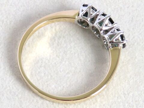 Each sapphire is securely set in polished white gold claw settings, creating a bright contrast that enhances the gemstones’ sparkle and colour. The slim yellow gold band adds warmth and sophistication, giving the ring a luxurious two-tone finish.