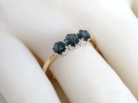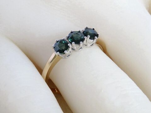 A timeless classic with a modern two-tone twist — this 1.29ct Natural Teal Sapphire 3-Stone Ring is crafted in an elegant combination of 9k Yellow Gold and 9k White Gold. Featuring three brilliant round-cut teal sapphires, this design captures the enchanting depth of blue-green hues that teal sapphires are loved for.