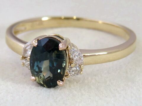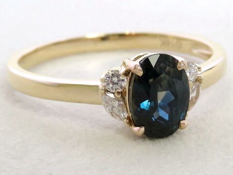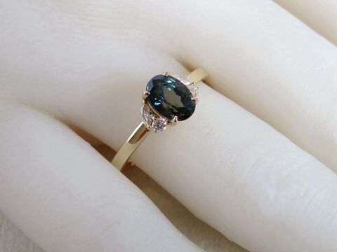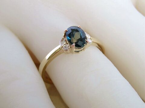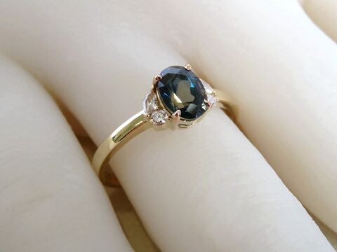 This elegant 14k yellow gold engagement ring features a striking 1.35ct natural oval-cut Parti Sapphire, displaying a beautiful blend of deep blue, green, and hints of yellow hues — a signature look of this rare Australian gemstone. On each side, two natural diamonds (a pair of round and marquise cuts) bring a refined sparkle, perfectly framing the vibrant centre stone.