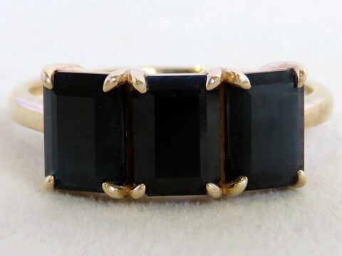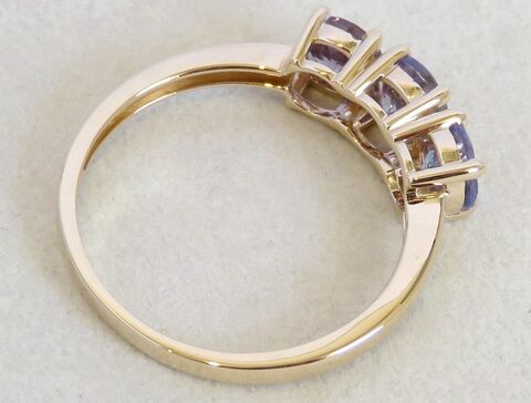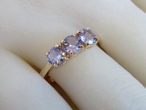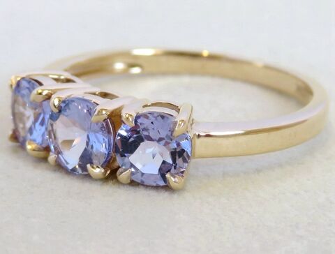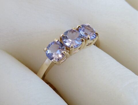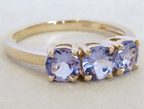 This stunning 9k yellow gold ring features three natural round-cut Tanzanite stones, totaling 1.45ct. The Tanzanites, with their soft light violet hue, are set in a timeless three-stone design, each secured in a four-prong setting that enhances their delicate color. The warm yellow gold band perfectly complements the unique beauty of the Tanzanite stones, creating an elegant and refined piece. Ideal for those seeking a sophisticated ring with a touch of unique charm, this Tanzanite ring is perfect for any special occasion.
