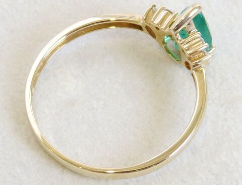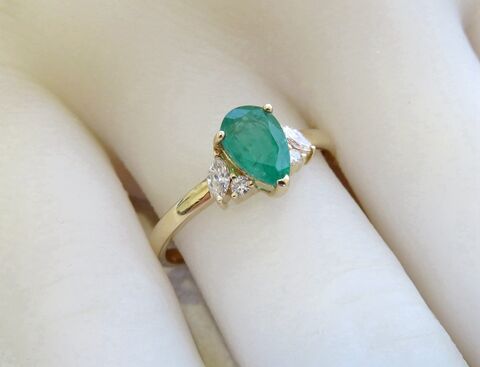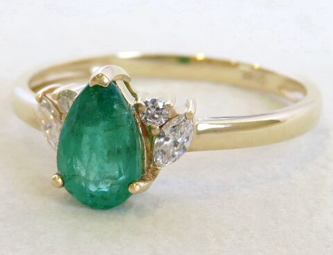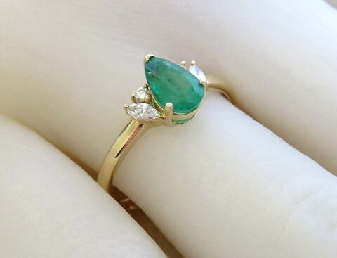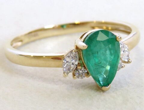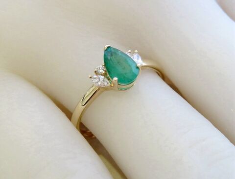 This sophisticated 14k yellow gold ring features a vivid 1ct natural pear cut emerald at its center. Each side is accented with a marquise cut diamond and a round cut diamond, together weighing 0.16ct. The polished gold band adds a refined finish, making this a timeless and elegant piece—perfect as an emerald engagement ring or a meaningful gift for anniversaries and special occasions.