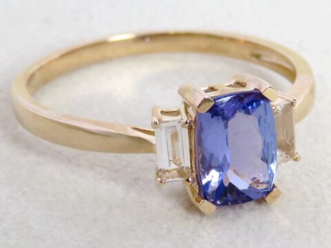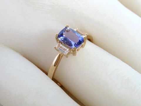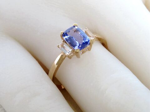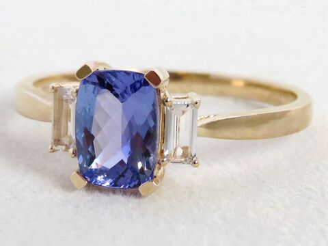 Elevate your collection with this exquisite Tanzanite and White Sapphire three-stone ring. At its heart sits a vivid 1.0ct cushion-cut natural Tanzanite, renowned for its captivating violet-blue hue that shifts beautifully in the light. The center stone is elegantly accented by two baguette-cut natural White Sapphires, adding brilliance and balance to the design.