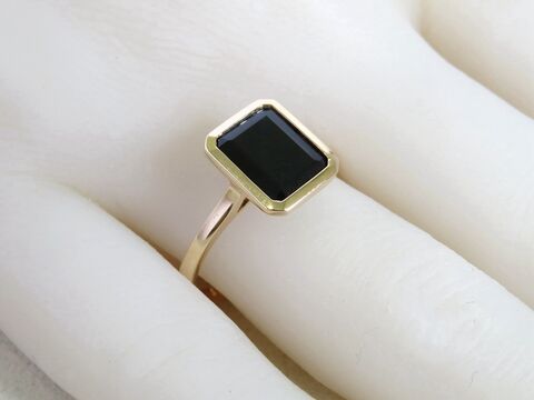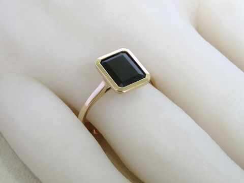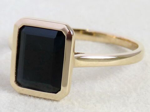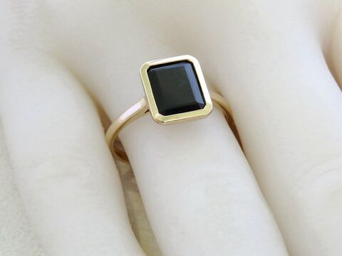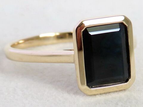 This elegant ring features a 2.6ct natural Black Sapphire in a sophisticated emerald cut, bezel set in warm 9k yellow gold. The minimalist design highlights the deep, mysterious tones of the sapphire while ensuring secure everyday wear.