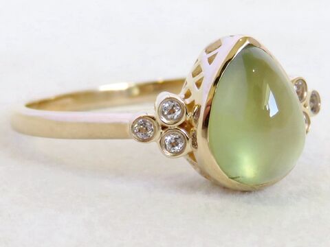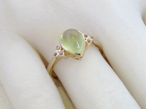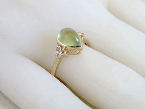 Introducing a soft, elegant, and nature-inspired 2ct Pear-Shaped Prehnite Ring crafted in polished 9k Yellow Gold. This design showcases a serene pear-cut prehnite cabochon, known for its calming light-green glow and smooth, luminous finish.