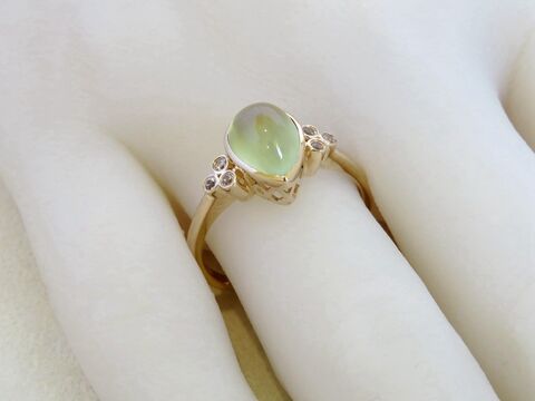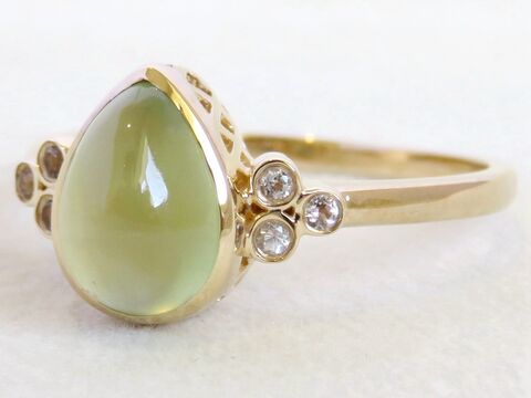 Set in a clean and modern bezel setting, the prehnite is beautifully complemented by clusters of natural White Sapphires on each side. These bezel-set accent stones add a refined sparkle and enhance the organic feel of the centre gem.