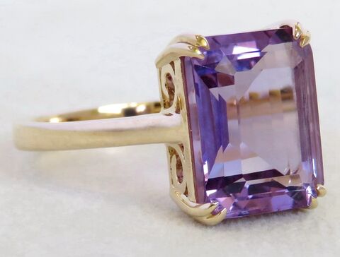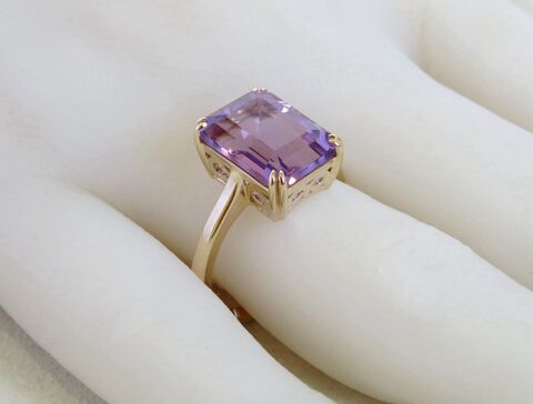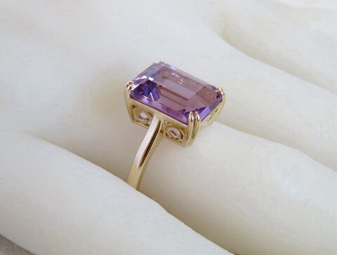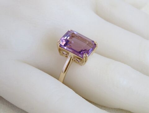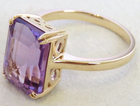This striking ring features a natural 5ct Amethyst in a bold emerald-cut design, showcasing vibrant purple hues and exceptional clarity. The stone is secured with elegant claw prongs and elevated by an intricate, vintage-inspired gallery that allows light to flow through beautifully.