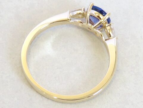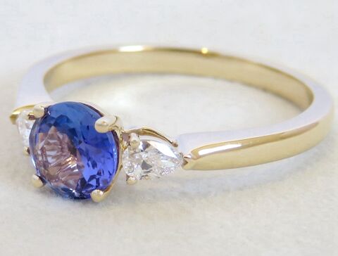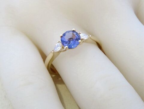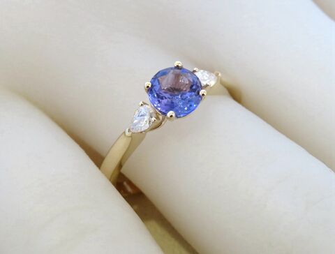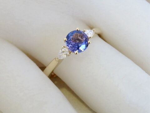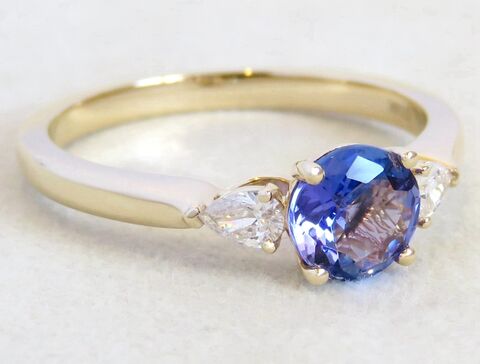 This stunning three-stone Tanzanite and Diamond ring captures timeless elegance with a modern touch. The centrepiece features a 6mm natural round-cut Tanzanite, radiating a captivating violet-blue brilliance. On each side, natural pear-cut diamonds add a graceful sparkle, perfectly complementing the rich hue of the Tanzanite.